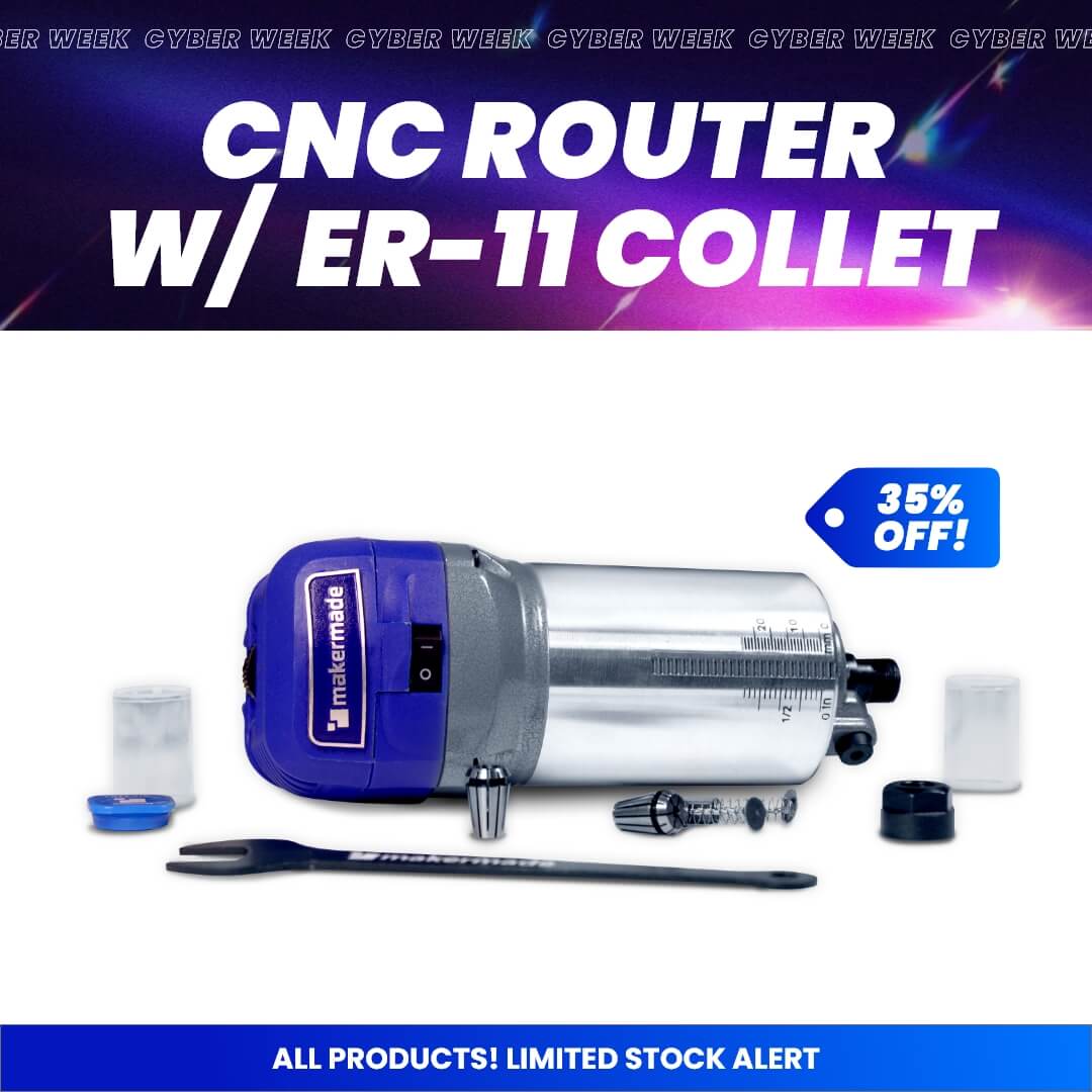 MakerMade's CNC Router with an ER-11 collet opens you up to a whole new world of router bits and End Mills not found on your standard hardware store router. Specifically designed for your M2, Maslow, or other hobby CNC machines with a 65mm diameter spindle. The MakerMade CNC Router boasts a lengthy 12-foot (3.5-meter) power cable for use on various frame sizes without extension cords. A powerful 1 HP motor with 6-speed variable control for speeds ranging from 10,000 RPM to 33,000 RPM running on quality NSK bearings. Includes 1/8" & 1/4" ER-11 collets with a wrench, extra brushes for power users, and support from MakerMade!