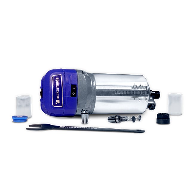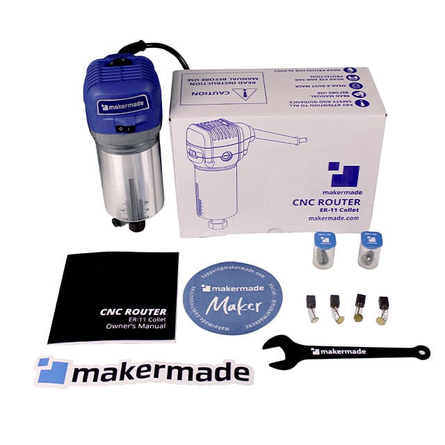 MakerMade's CNC Router with an ER-11 collet opens you up to a whole new world of router bits and End Mills not found on your standard hardware store router. Specifically designed for your M2, Maslow, or other hobby CNC machines with a 65mm diameter spindle. The MakerMade CNC Router boasts a lengthy 12-foot (3.5-meter) power cable for use on various frame sizes without extension cords. A powerful 1 HP motor with 6-speed variable control for speeds ranging from 10,000 RPM to 33,000 RPM running on quality NSK bearings. Includes 1/8" & 1/4" ER-11 collets with a wrench, extra brushes for power users, and support from MakerMade!